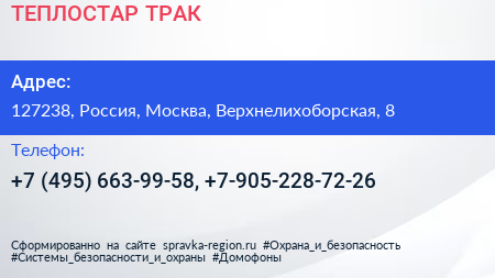ТЕПЛОСТАР-ТРАК по адресу 127238, Россия, Москва, Верхнелихоборская, 8 в дальнейшем Организация, размещена в следующих категориях: