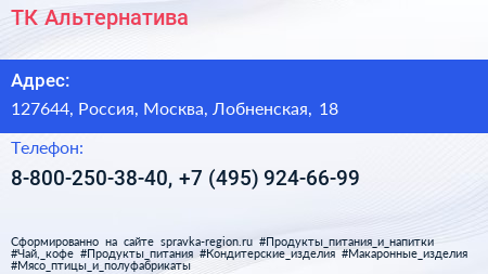 ТК Альтернатива по адресу 127644, Россия, Москва, Лобненская, 18 в дальнейшем Организация, размещена в следующих категориях:
