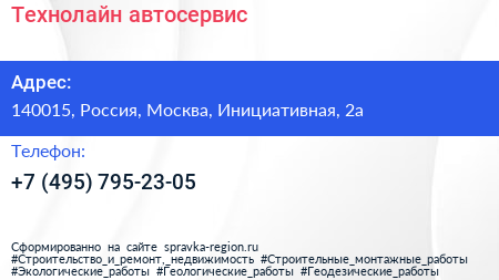 Технолайн, автосервис по адресу 140015, Россия, Москва, Инициативная, 2а в дальнейшем Организация, размещена в следующих категориях: