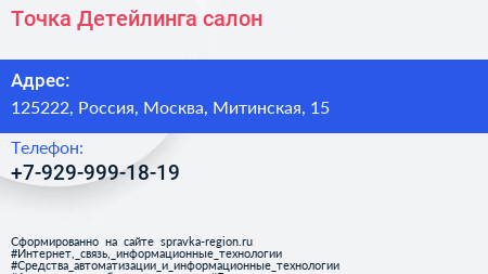Точка Детейлинга, салон по адресу 125222, Россия, Москва, Митинская, 15 в дальнейшем Организация, размещена в следующих категориях: