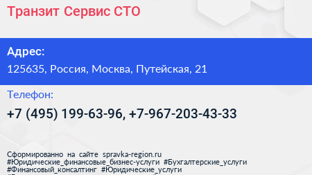Транзит Сервис, СТО по адресу 125635, Россия, Москва, Путейская, 21 в дальнейшем Организация, размещена в следующих категориях: