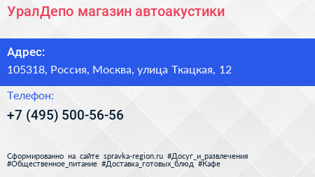 УралДепо, магазин автоакустики по адресу 105318, Россия, Москва, улица Ткацкая, 12 в дальнейшем Организация, размещена в следующих категориях: