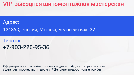 VIP, выездная шиномонтажная мастерская по адресу 121353, Россия, Москва, Беловежская, 22 в дальнейшем Организация, размещена в следующих категориях: