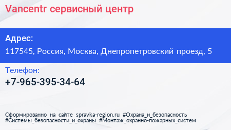 Vancentr, сервисный центр по адресу 117545, Россия, Москва, Днепропетровский проезд, 5 в дальнейшем Организация, размещена в следующих категориях: