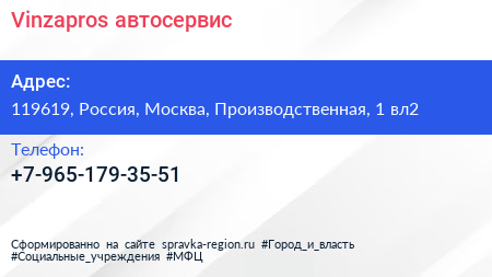 Vinzapros, автосервис по адресу 119619, Россия, Москва, Производственная, 1 вл2 в дальнейшем Организация, размещена в следующих категориях: