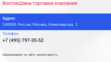 ВостокШина, торговая компания по адресу 140090, Россия, Москва, Алексеевская, 1 в дальнейшем Организация, размещена в следующих категориях: