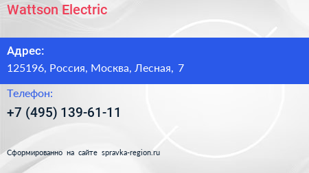 Wattson Electric по адресу 125196, Россия, Москва, Лесная, 7 в дальнейшем Организация, размещена в следующих категориях: