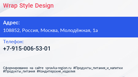 Wrap Style Design по адресу 108852, Россия, Москва, Молодёжная, 1а в дальнейшем Организация, размещена в следующих категориях: