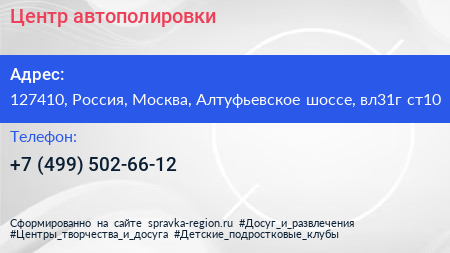 Центр автополировки по адресу 127410, Россия, Москва, Алтуфьевское шоссе, вл31г ст10 в дальнейшем Организация, размещена в следующих категориях:
