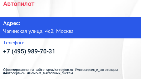 Автопилот по адресу Чагинская улица, 4с2, Москва в дальнейшем Организация, размещена в следующих категориях: