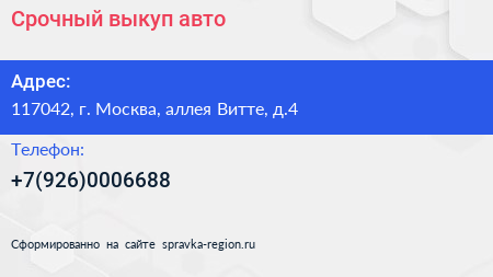 Срочный выкуп авто по адресу 117042, г. Москва, аллея Витте, д.4 в дальнейшем Организация, размещена в следующих категориях: