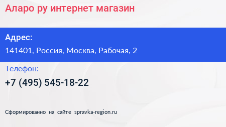 Аларо.ру, интернет-магазин по адресу 141401, Россия, Москва, Рабочая, 2 в дальнейшем Организация, размещена в следующих категориях:
