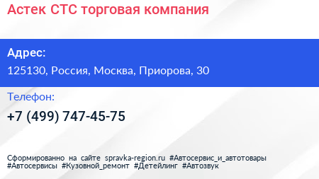 Астек-СТС, торговая компания по адресу 125130, Россия, Москва, Приорова, 30 в дальнейшем Организация, размещена в следующих категориях: