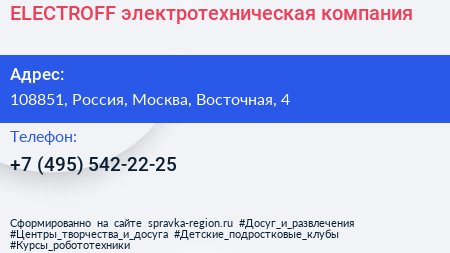 ELECTROFF, электротехническая компания по адресу 108851, Россия, Москва, Восточная, 4 в дальнейшем Организация, размещена в следующих категориях:
