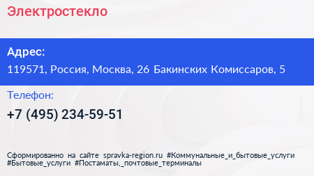 Электростекло по адресу 119571, Россия, Москва, 26 Бакинских Комиссаров, 5 в дальнейшем Организация, размещена в следующих категориях: