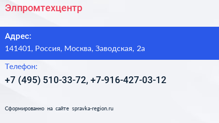 Элпромтехцентр по адресу 141401, Россия, Москва, Заводская, 2а в дальнейшем Организация, размещена в следующих категориях:
