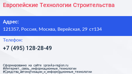 Европейские Технологии Строительства по адресу 121357, Россия, Москва, Верейская, 29 ст134 в дальнейшем Организация, размещена в следующих категориях: