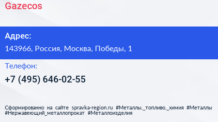Gazecos по адресу 143966, Россия, Москва, Победы, 1 в дальнейшем Организация, размещена в следующих категориях: