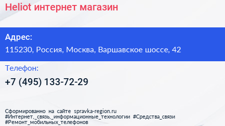 Heliot, интернет-магазин по адресу 115230, Россия, Москва, Варшавское шоссе, 42 в дальнейшем Организация, размещена в следующих категориях: