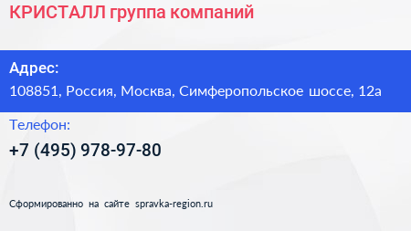 КРИСТАЛЛ, группа компаний по адресу 108851, Россия, Москва, Симферопольское шоссе, 12а в дальнейшем Организация, размещена в следующих категориях: