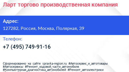 Ларт, торгово-производственная компания по адресу 127282, Россия, Москва, Полярная, 39 в дальнейшем Организация, размещена в следующих категориях: