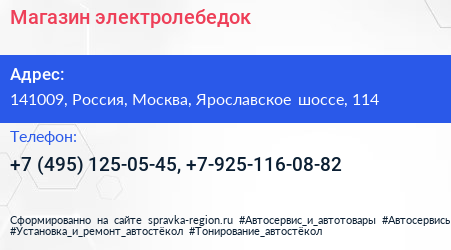 Магазин электролебедок по адресу 141009, Россия, Москва, Ярославское шоссе, 114 в дальнейшем Организация, размещена в следующих категориях:
