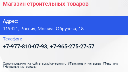 Магазин строительных товаров по адресу 119421, Россия, Москва, Обручева, 18 в дальнейшем Организация, размещена в следующих категориях: