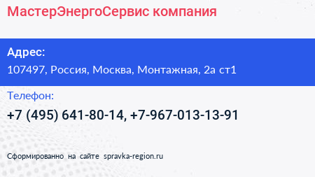 МастерЭнергоСервис, компания по адресу 107497, Россия, Москва, Монтажная, 2а ст1 в дальнейшем Организация, размещена в следующих категориях: