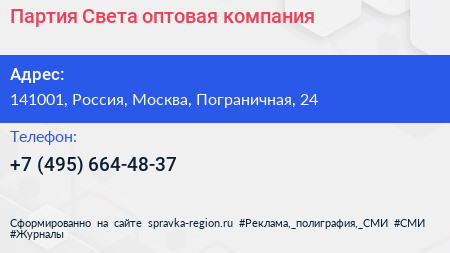 Партия Света, оптовая компания по адресу 141001, Россия, Москва, Пограничная, 24 в дальнейшем Организация, размещена в следующих категориях:
