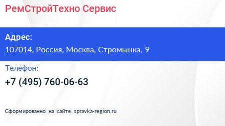 РемСтройТехно-Сервис по адресу 107014, Россия, Москва, Стромынка, 9 в дальнейшем Организация, размещена в следующих категориях: