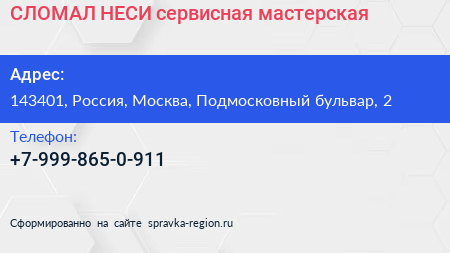 СЛОМАЛ-НЕСИ, сервисная мастерская по адресу 143401, Россия, Москва, Подмосковный бульвар, 2 в дальнейшем Организация, размещена в следующих категориях:
