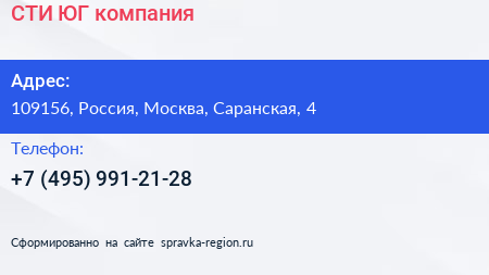 СТИ-ЮГ, компания по адресу 109156, Россия, Москва, Саранская, 4 в дальнейшем Организация, размещена в следующих категориях: