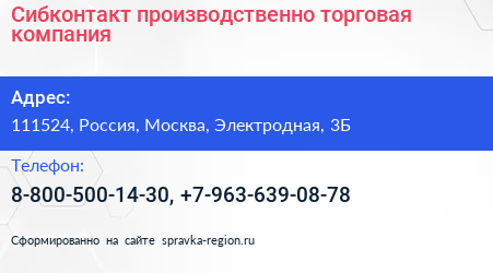 Сибконтакт, производственно-торговая компания по адресу 111524, Россия, Москва, Электродная, 3Б в дальнейшем Организация, размещена в следующих категориях:
