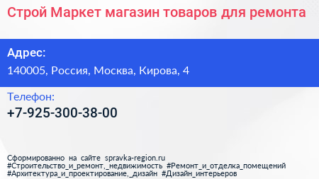 Строй Маркет, магазин товаров для ремонта по адресу 140005, Россия, Москва, Кирова, 4 в дальнейшем Организация, размещена в следующих категориях: