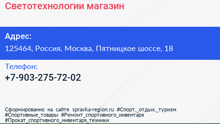 Светотехнологии, магазин по адресу 125464, Россия, Москва, Пятницкое шоссе, 18 в дальнейшем Организация, размещена в следующих категориях: