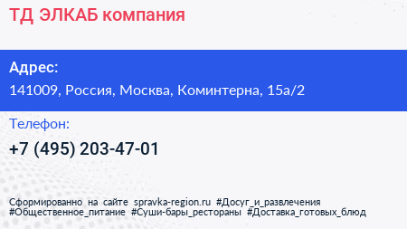 ТД-ЭЛКАБ, компания по адресу 141009, Россия, Москва, Коминтерна, 15а/2 в дальнейшем Организация, размещена в следующих категориях: