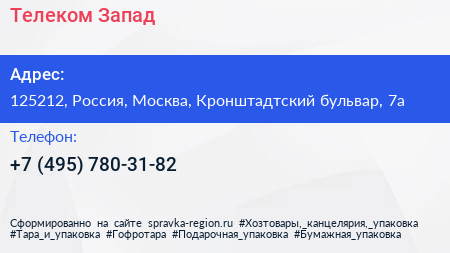 Телеком-Запад по адресу 125212, Россия, Москва, Кронштадтский бульвар, 7а в дальнейшем Организация, размещена в следующих категориях: