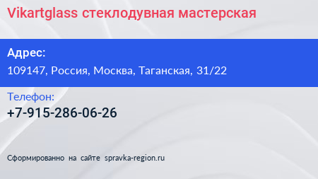 Vikartglass, стеклодувная мастерская по адресу 109147, Россия, Москва, Таганская, 31/22 в дальнейшем Организация, размещена в следующих категориях: