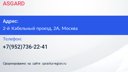 ASGARD по адресу 2-й Кабельный проезд, 2А, Москва в дальнейшем Организация, размещена в следующих категориях: