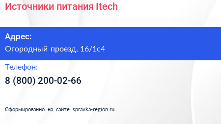 Источники питания Itech по адресу Огородный проезд, 16/1с4 в дальнейшем Организация, размещена в следующих категориях: