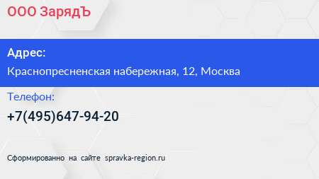 ООО ЗарядЪ по адресу Краснопресненская набережная, 12, Москва в дальнейшем Организация, размещена в следующих категориях: