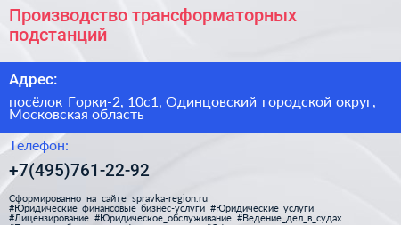 Производство трансформаторных подстанций по адресу посёлок Горки-2, 10с1, Одинцовский городской округ, Московская область в дальнейшем Организация, размещена в следующих категориях: