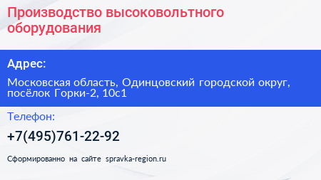 Производство высоковольтного оборудования по адресу Московская область, Одинцовский городской округ, посёлок Горки-2, 10с1 в дальнейшем Организация, размещена в следующих категориях:
