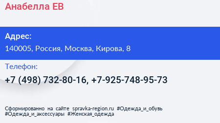 Анабелла ЕВ по адресу 140005, Россия, Москва, Кирова, 8 в дальнейшем Организация, размещена в следующих категориях: