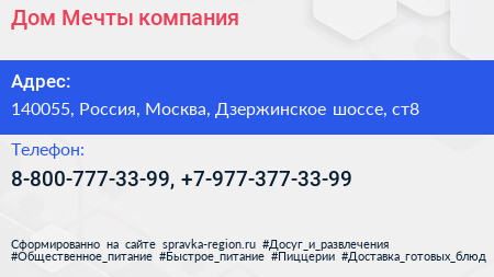 Дом Мечты, компания по адресу 140055, Россия, Москва, Дзержинское шоссе, ст8 в дальнейшем Организация, размещена в следующих категориях: