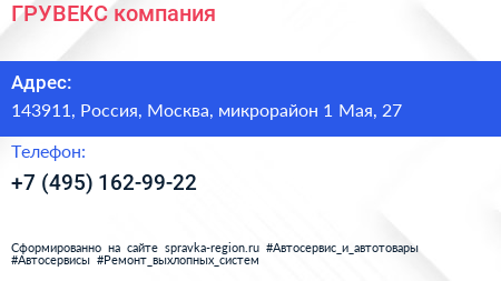 ГРУВЕКС, компания по адресу 143911, Россия, Москва, микрорайон 1 Мая, 27 в дальнейшем Организация, размещена в следующих категориях: