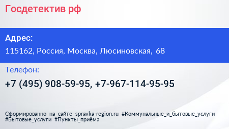 Госдетектив.рф по адресу 115162, Россия, Москва, Люсиновская, 68 в дальнейшем Организация, размещена в следующих категориях: