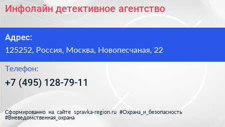 Инфолайн, детективное агентство по адресу 125252, Россия, Москва, Новопесчаная, 22 в дальнейшем Организация, размещена в следующих категориях:
