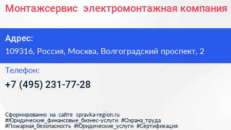 Монтажсервис+, электромонтажная компания по адресу 109316, Россия, Москва, Волгоградский проспект, 2 в дальнейшем Организация, размещена в следующих категориях: