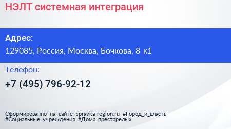 НЭЛТ системная интеграция по адресу 129085, Россия, Москва, Бочкова, 8 к1 в дальнейшем Организация, размещена в следующих категориях: